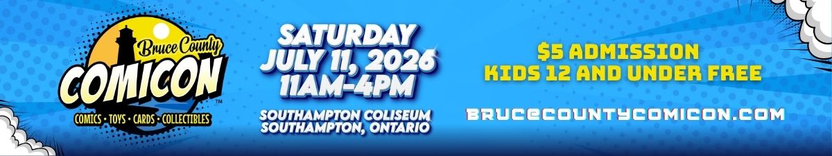 Bruce County Comicon returns on Saturday, July 11, 2026, at the Southampton Coliseum from 11am-4pm. This fan-favourite event brings together over 150 vendors from across Ontario, offering an incredible selection of trading cards, comic books, action figures, vintage toys, artwork, video games, and all things collectible.